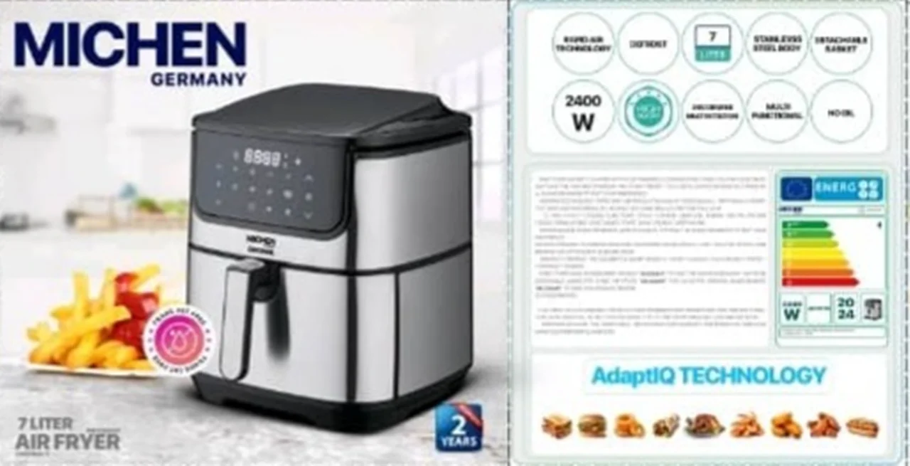 توان مصرفی این سرخ کن 2400 وات است و در ساختار این دستگاه سرخ کن، از یک المنت با توان مصرفی 2400 وات استفاده شده است. از دیگر ویژگی های این محصول می توان به چند کاره بودن آن اشاره نمود. شما می توانید با استفاده از سرخ کن بدون روغن میشن 7 لیتر MICHEN انواع سیب زمینی، اسنک، مرغ، جوجه، همبرگر، سوسیس، گوشت، ماهی، کیک، مافین، نان تست، سبزیجات و … را طبخ نمایید. تکنولوژی به کار رفته در این محصول، Rapid Air می باشد. مزیت این تکنولوژی بدین صورت است که گردش هوا را در داخل سرخ کن سرعت بخشیده و پخش بو را در زمان سرخ کردن ماده غذایی به حداقل می رساند. این دستگاه سرخ کن، این امکان را به شما می دهد تا غذای سرخ شده خود را گرم نگه دارید. در واقع قابلیت گرم نگهدارندگی را دارا می باشد.یکی از ویژگی های منحصر به فرد این محصول، سیستم ایمنی تعبیه شده در ساختار آن است. به طوری که پایه های آن ضد لغزش و سر خوردن می باشند و برای امنیت بیش تر از پایه های لاستکی برای ثبات بیش تر دستگاه استفاده شده است. هم چنین شما می توانید به راحتی و با استفاده از یک دکمه، درب سرخ کن را باز نمایید. پس از استفاده از سرخ کن می توانید قطعات آن را در ماشین ظرف شویی گذاشته و به راحتی آن را شستشو دهید.