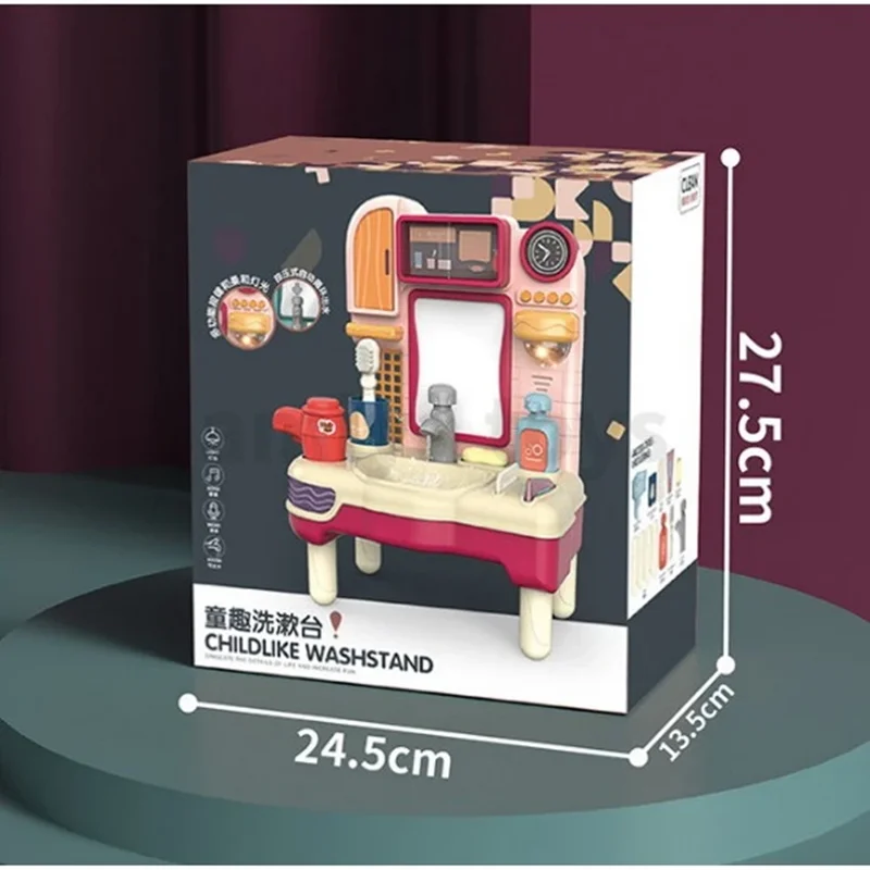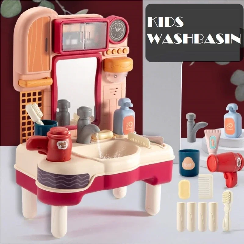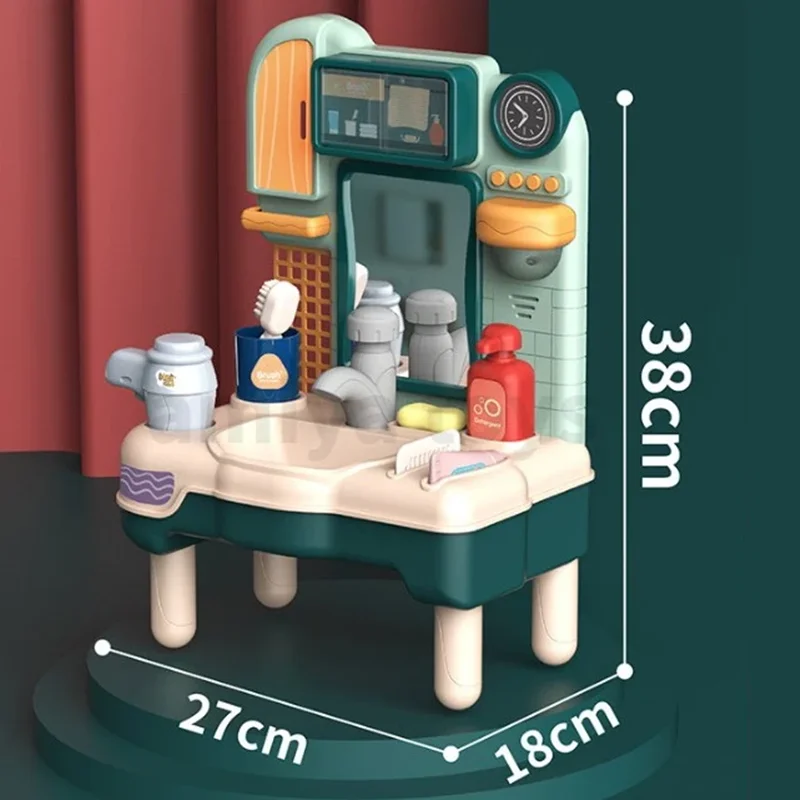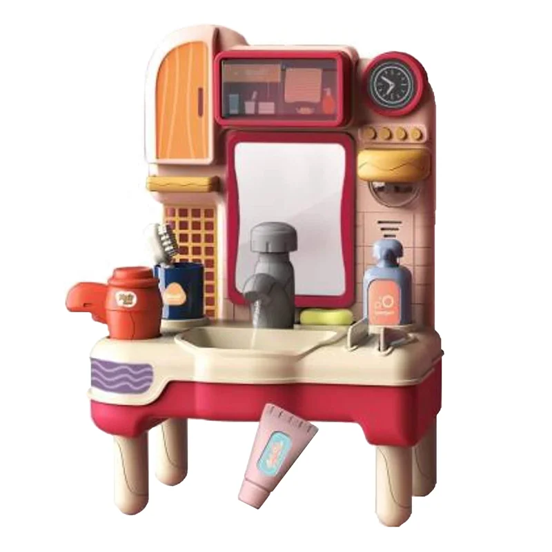 کودکان بسیاری از مهارت های اساسی را از طریق بازی یاد می گیرند و تمرین می کنند. اسباب بازی سینک روشویی وسیله مناسبی برای آموزش رعایت بهداشت فردی به کودکان می باشد. این اسباب بازی دارای پمپ غیرالکتریکی با قابلیت پمپاژ آب می باشد که طول عمر بیشتری نسبت به مدل های الکتریکی دارد. صرفه جویی در مصرف آب از سنین پایین شروع به شکل گیری می کند که با این اسباب بازی می توان به کودک آموزش داد. در بالای آینه فضای ذخیره سازی وجود دارد. این روشویی شامل جا حوله ای، جای سشوار و جا شامپو نیز می باشد. این مجموعه اسباببازی به همراه سینک، آینه، سشوار، فنجان، مسواک، خمیر دندان، ژل دوش، شامپو، شانه و پخش کننده موزیک ارائه میشود. کودکان ما می توانند در طول فرآیند پاکیزگی به موسیقی های مختلف گوش دهند و نور رنگارنگ را ببینند.